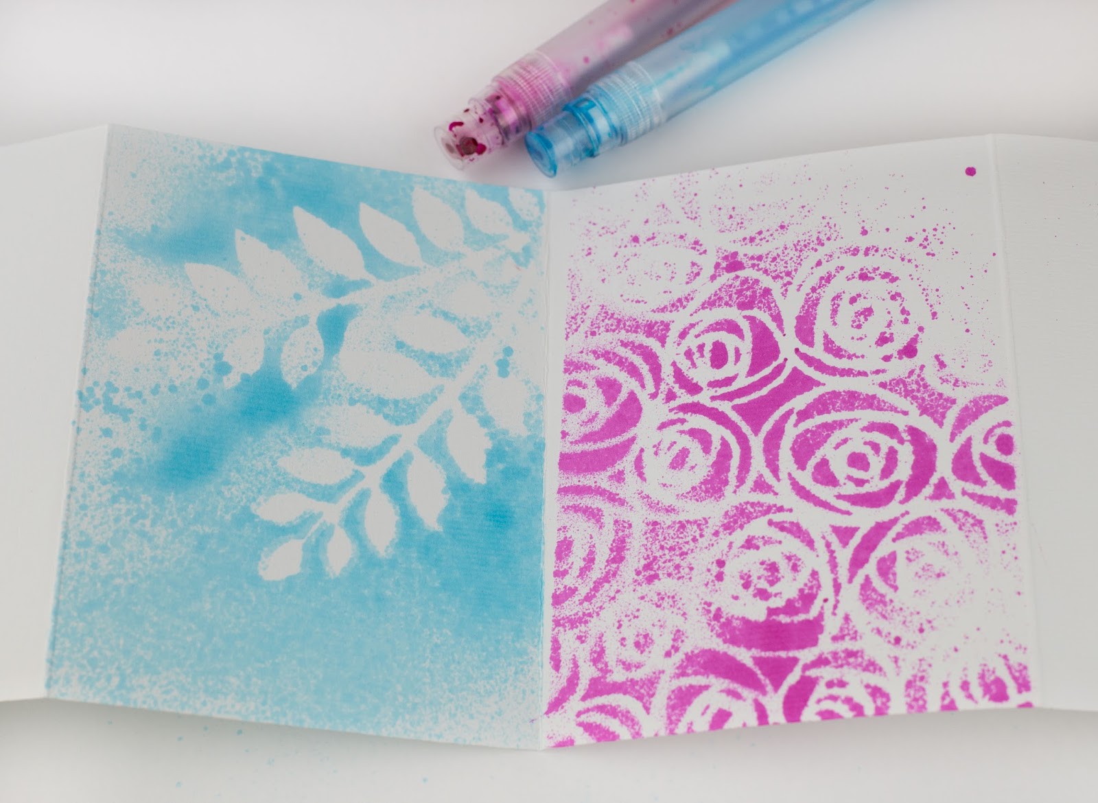 I used Media ink spray (from Pentart) to decorate the pages. This way is easy and fun, the result is just dispendious.